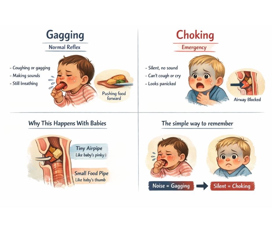When babies start learning to eat, gagging can look scary. Many parents worry that their baby is choking, but gagging and choking are not the same. Knowing the difference helps you stay calm and respond correctly.
