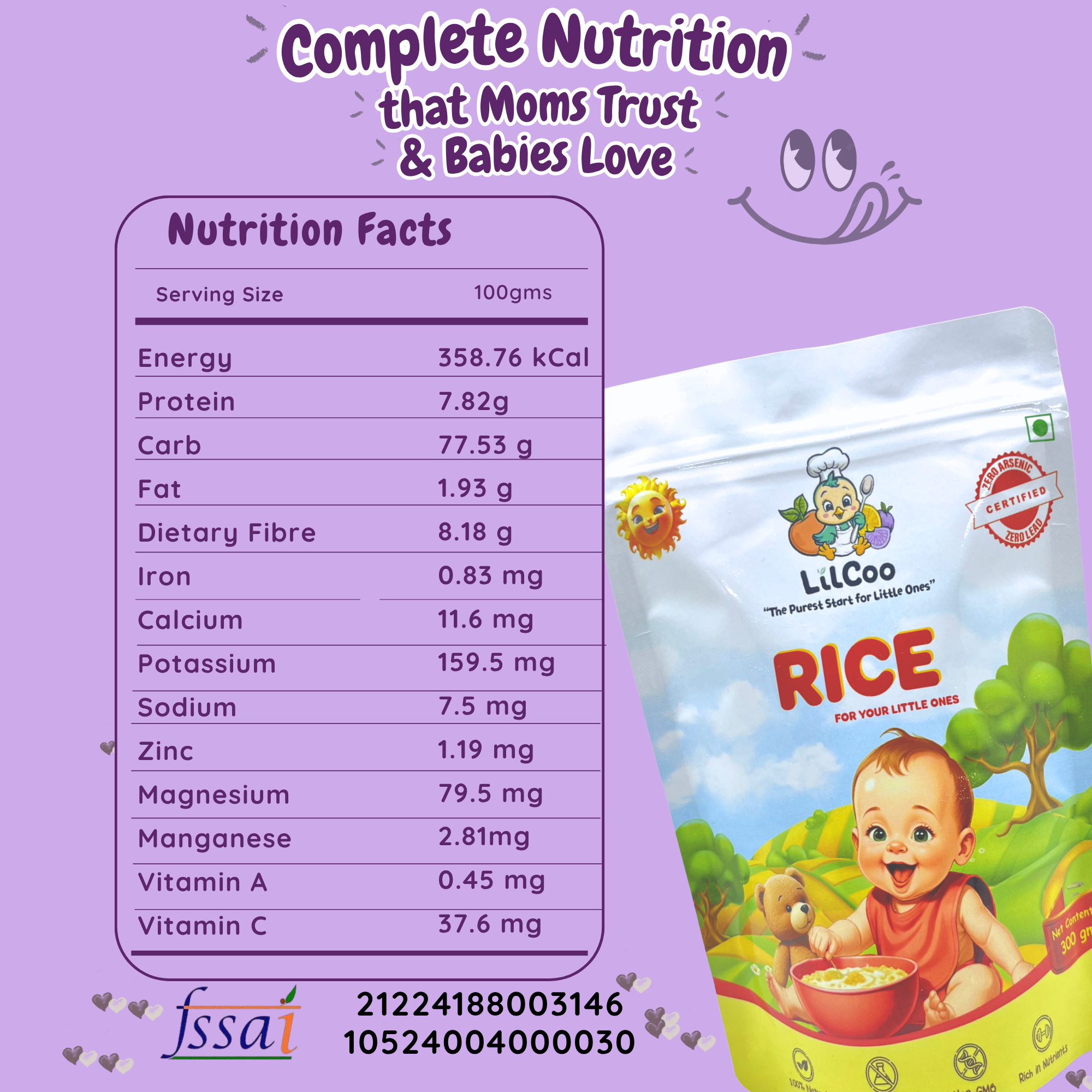 Rich in 13 nutrients. Rich in Protein. High Fibre – Ensures babies dont have constipation. High Calcium – Helps develop stron bones and teeth. High Vitamin C – Helps build immunity. High Vitamins & Minerals – Helps in Brain Development and IQ improvement. Tested in Lab and Proven Arsenic – Free. 100% No Cancer, No Kidney, Lung and Gut damage. Only tested and certified Arsenic-free Rice in India. Lead Free. Mercury Free. Cadmium Free. 100% Organic, No GMO. Aromatic & Flavorful.