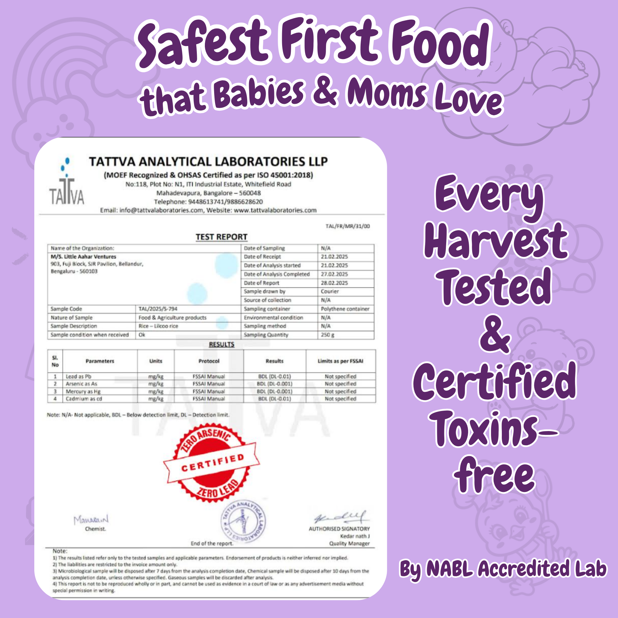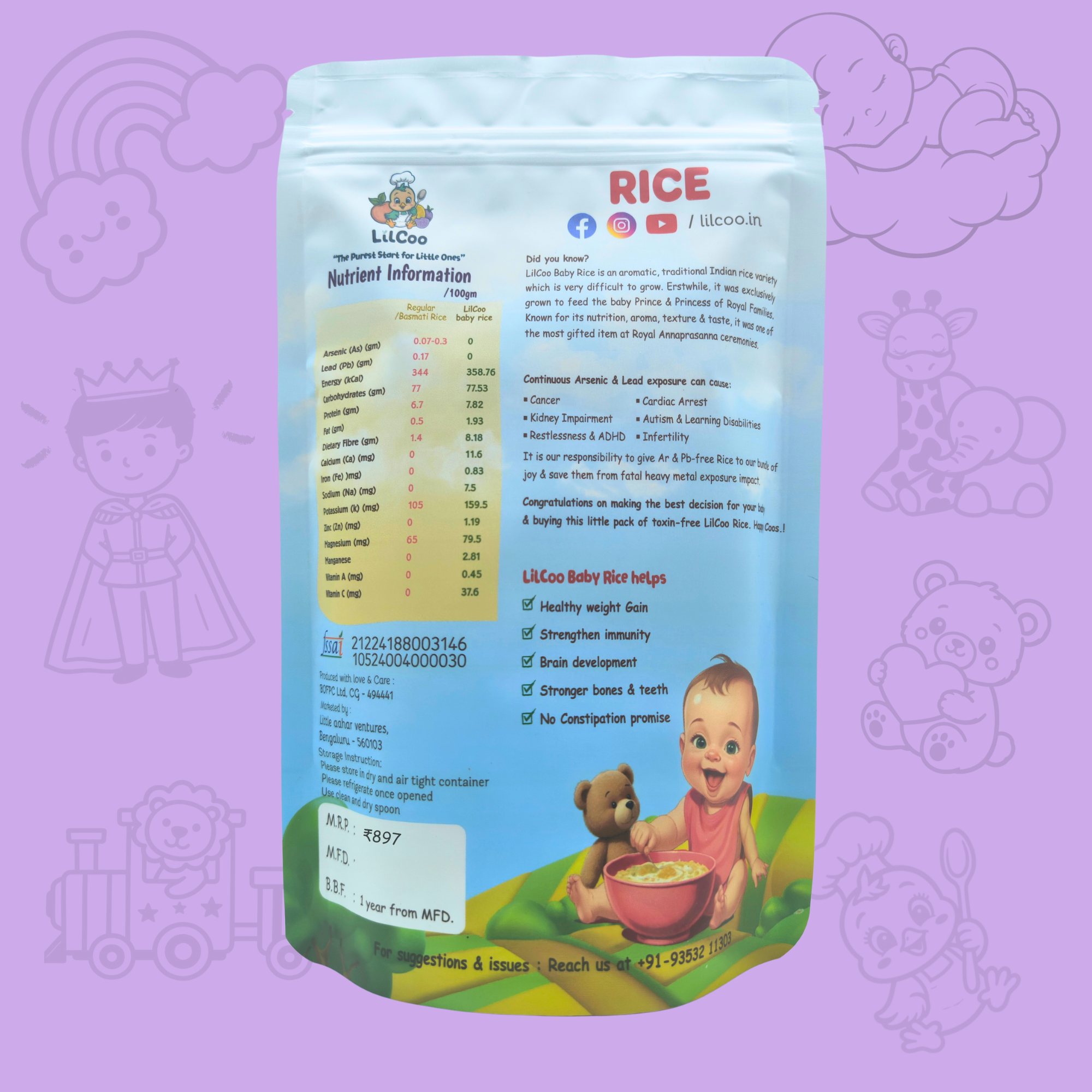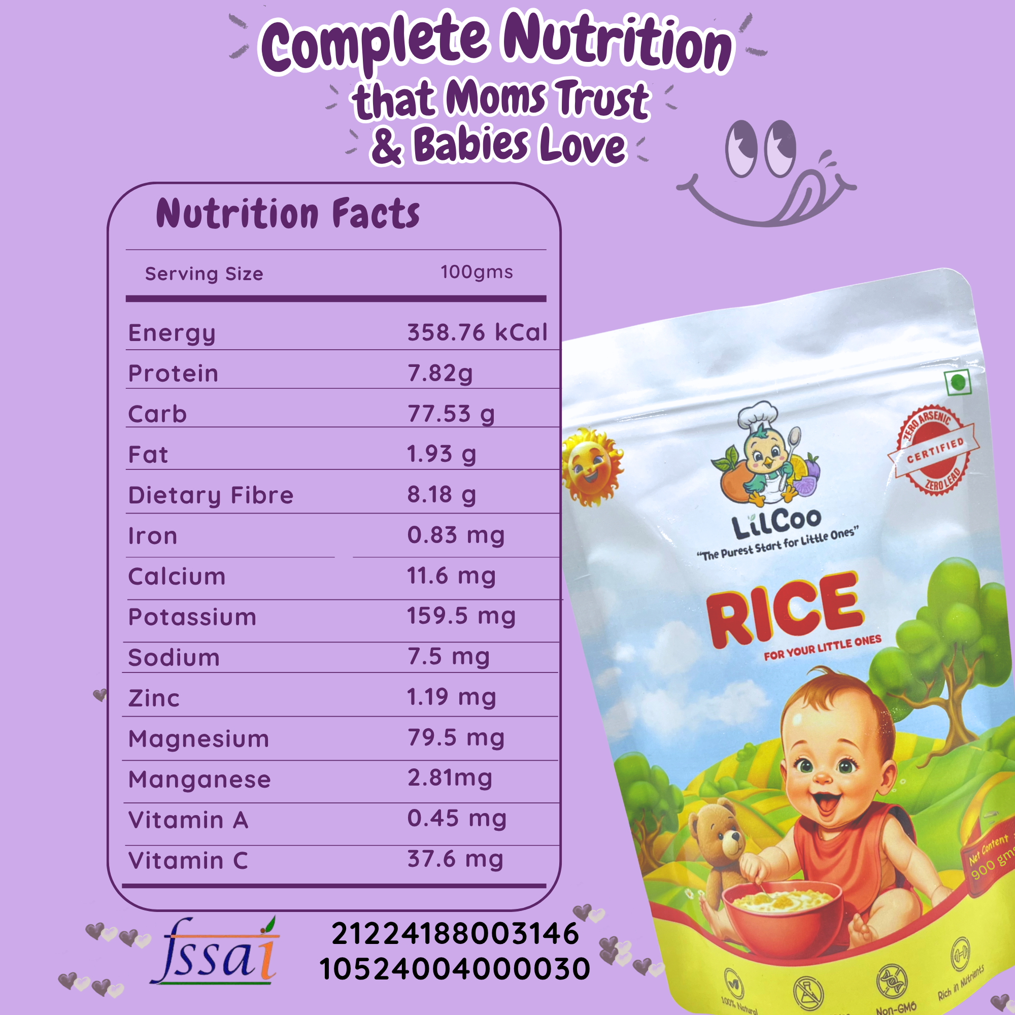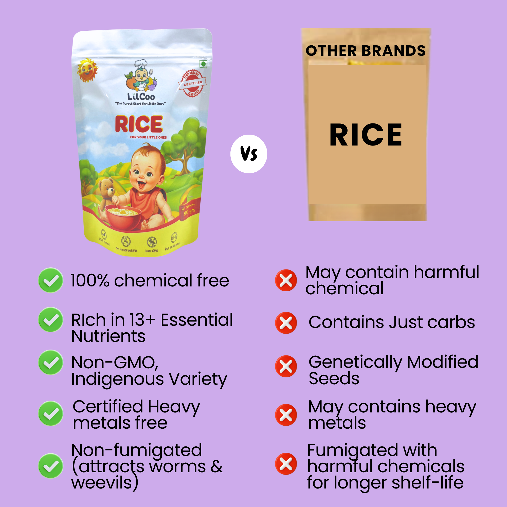 - Certified Arsenic free – Arsenic is a heavy metal known to cause cancer in babies. 93% of the rice cultivated in India contains Arsenic