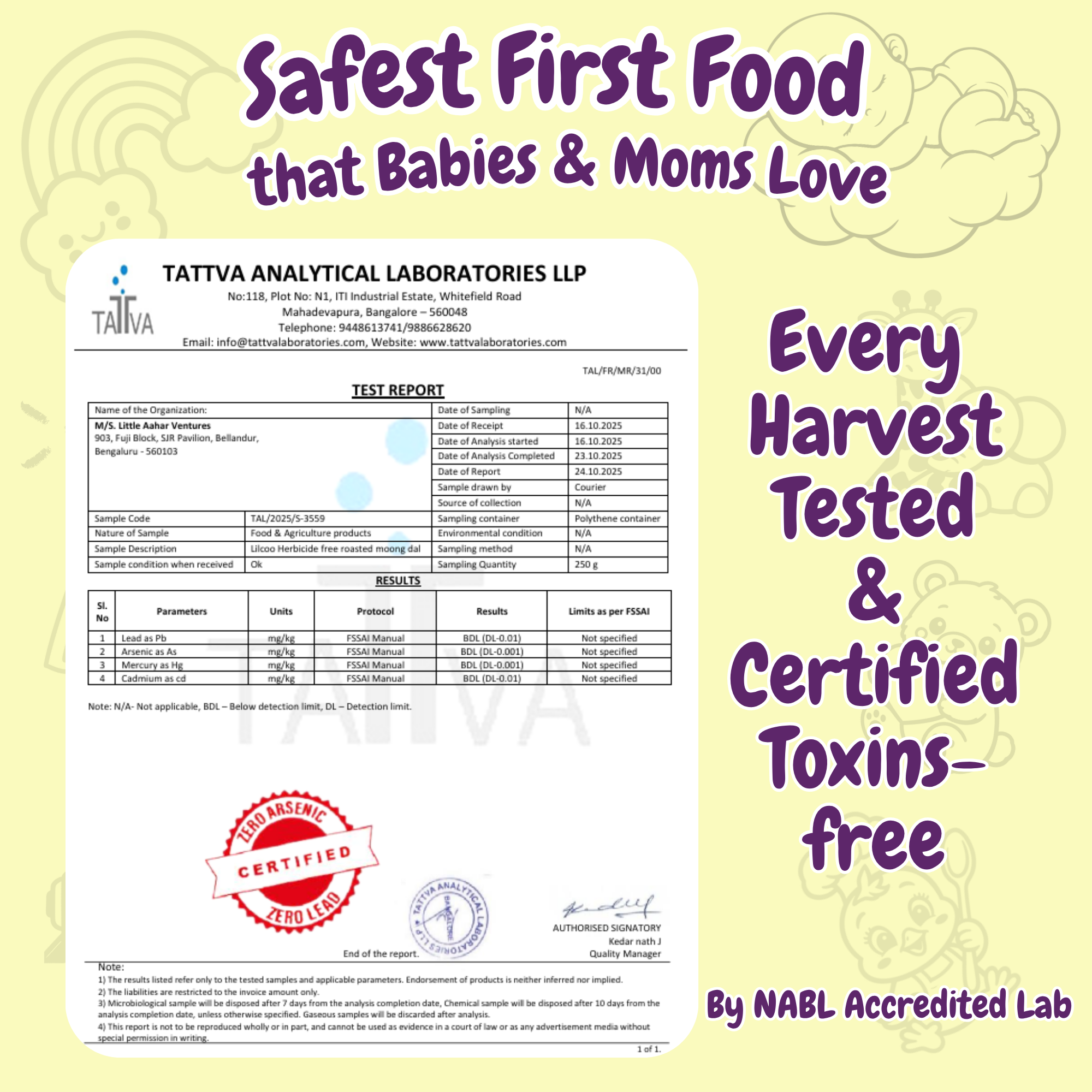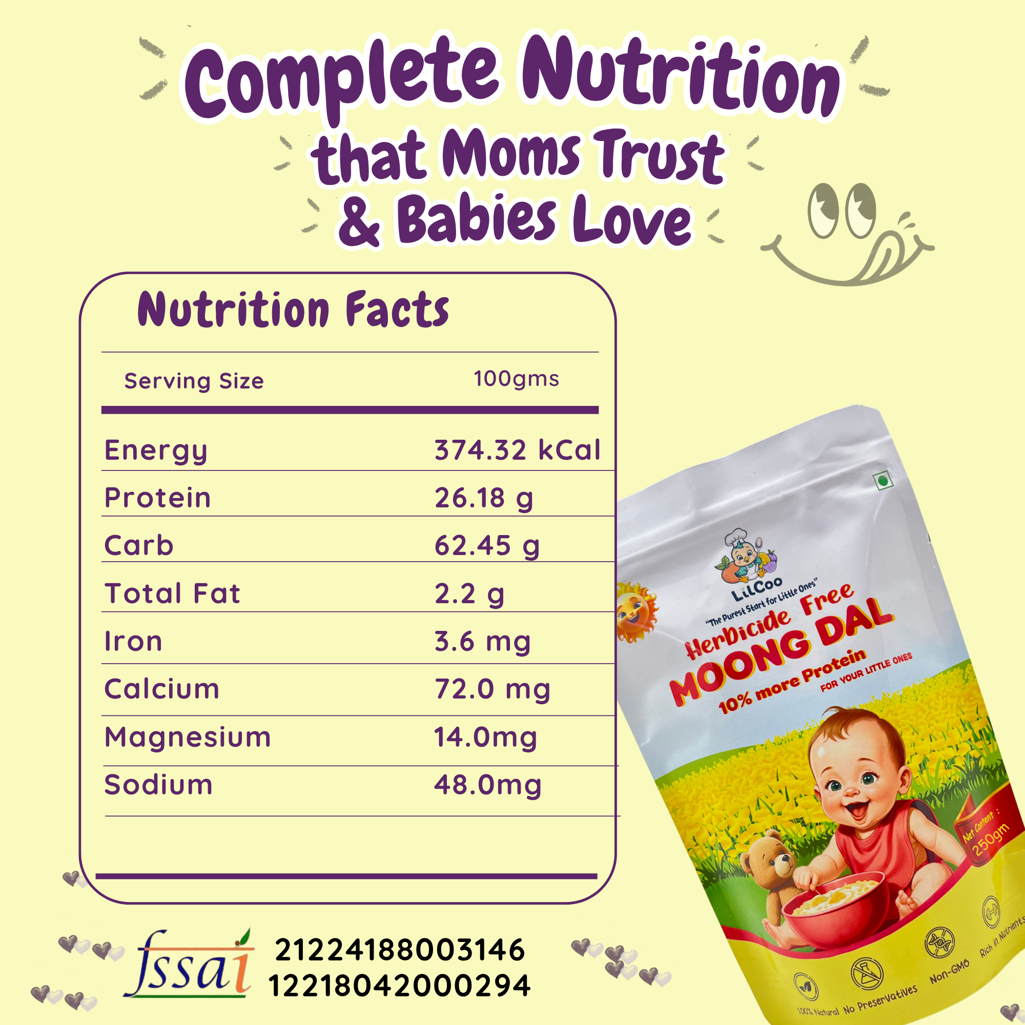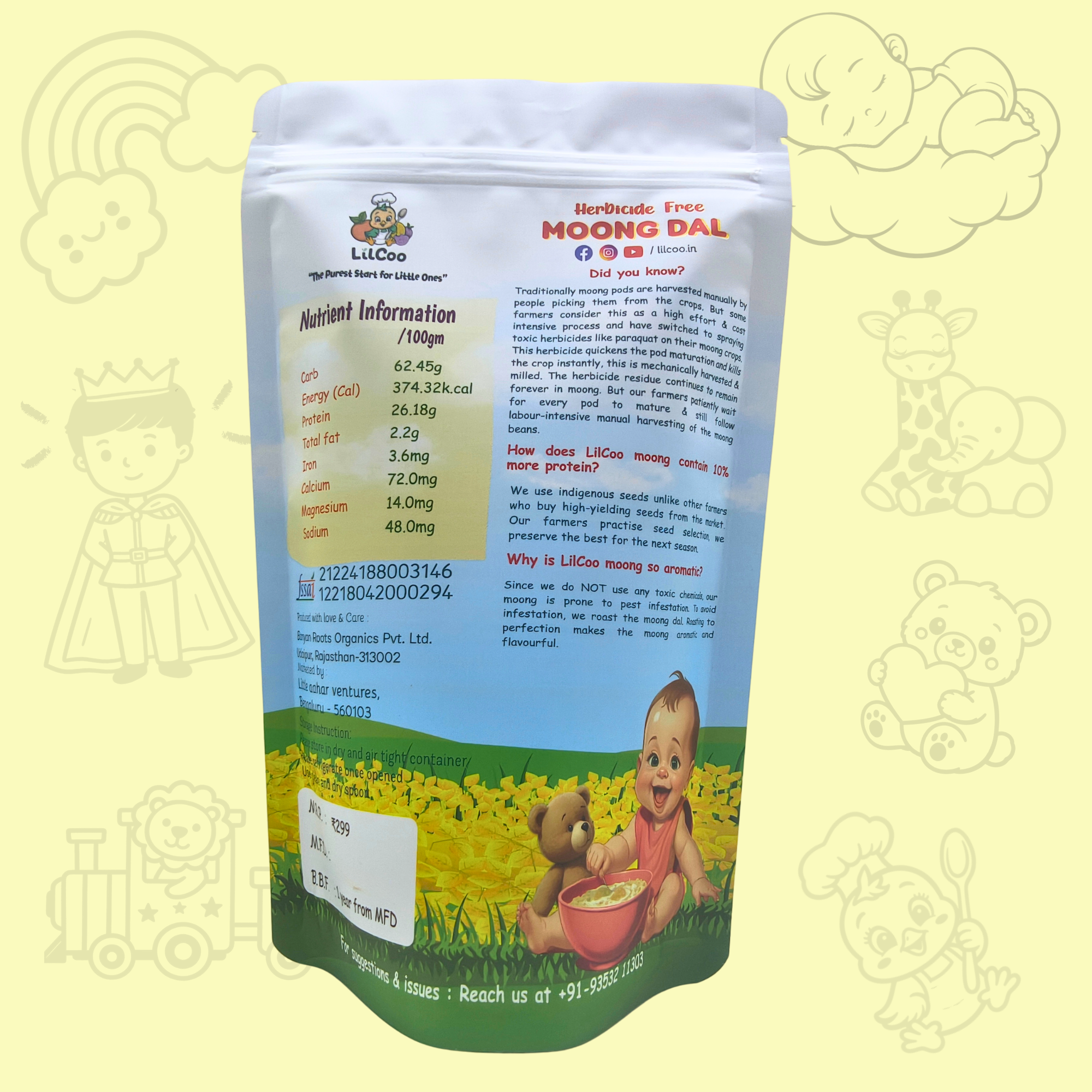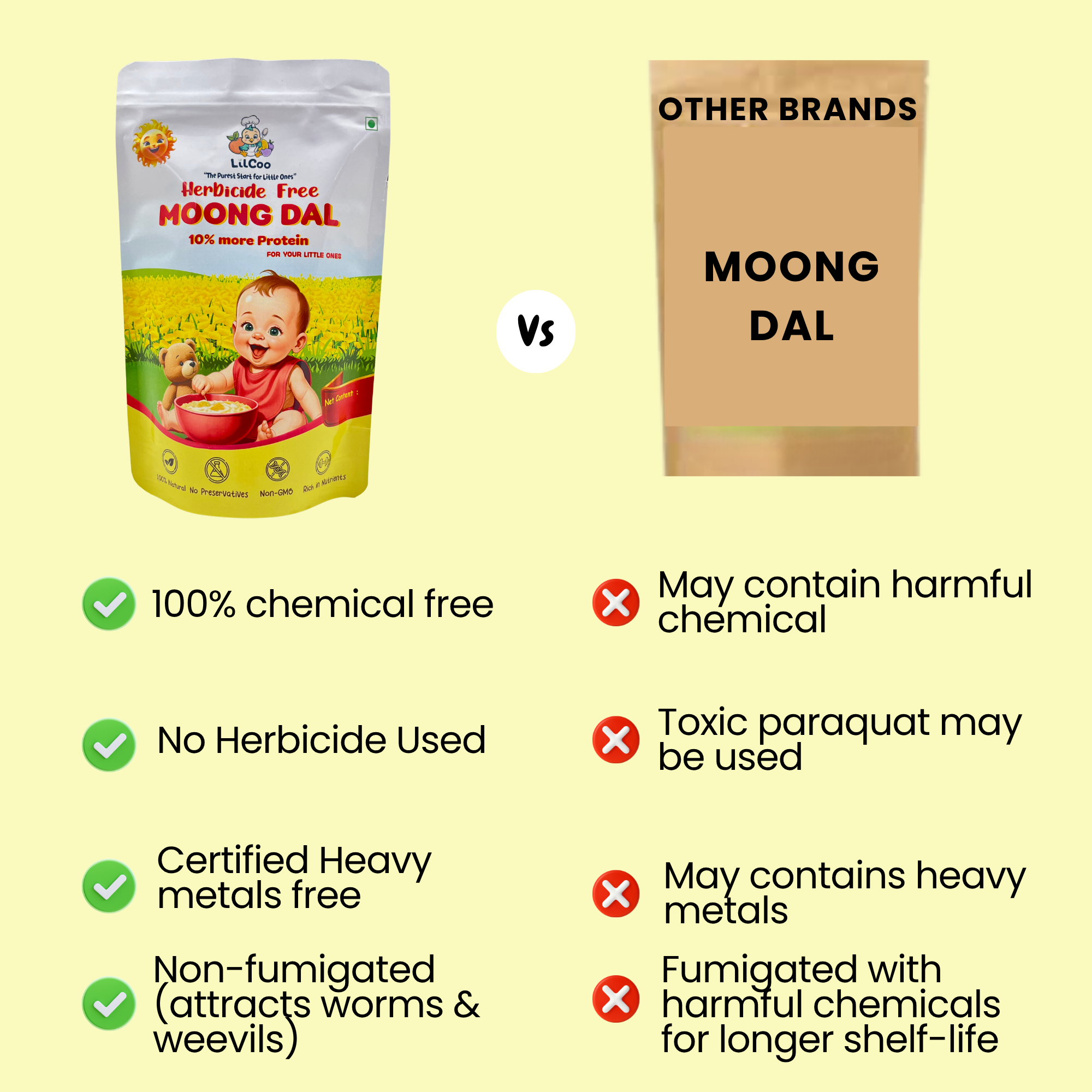 Paraquat is a herbicide which is commonly used in the harvest of moong in India. Its toxic chemical which is banned in US and EU. In Dec 2024, Govt is still trying to educate farmers to avoid Paraquat. Without Paraquat, harvesting moong is time consuming and manual. And the Paraquat sprayed moong might be there in your pantry now! You might be feeding your little one the same! Wait, we got you covered. Our farmers in the Ganjam district of Orissa, still follow seed selection and traditional harvesting practices. We use Non GMO seeds. Carefully harvest pod by pod and hand pound them to split the moong. That is why no 2 pieces of dal are alike in LilCoo herbicide free moong dal. The best thing is LilCoo herbicide free moong dal is loved by weevils because its toxin-free. To avoid weevils, we mildly roast the dal and then pack them with love. When every moong dal in the market gives you 23-24gms of protein, LilCoo herbicide free moong dal gives 10% more protein. What more? Fill those little tummies with pure and nutrient dense food
