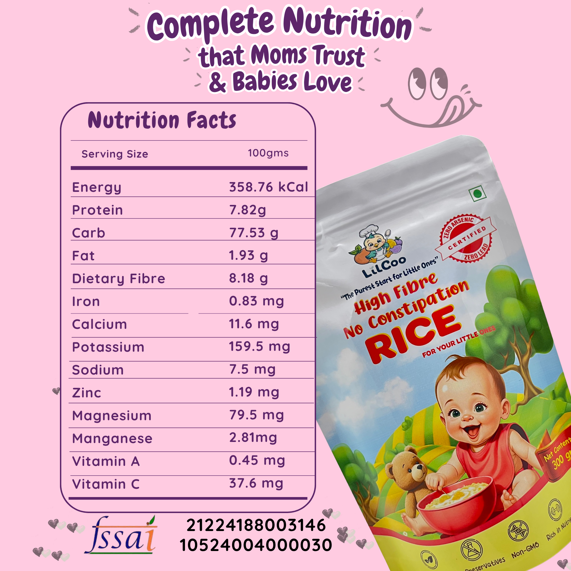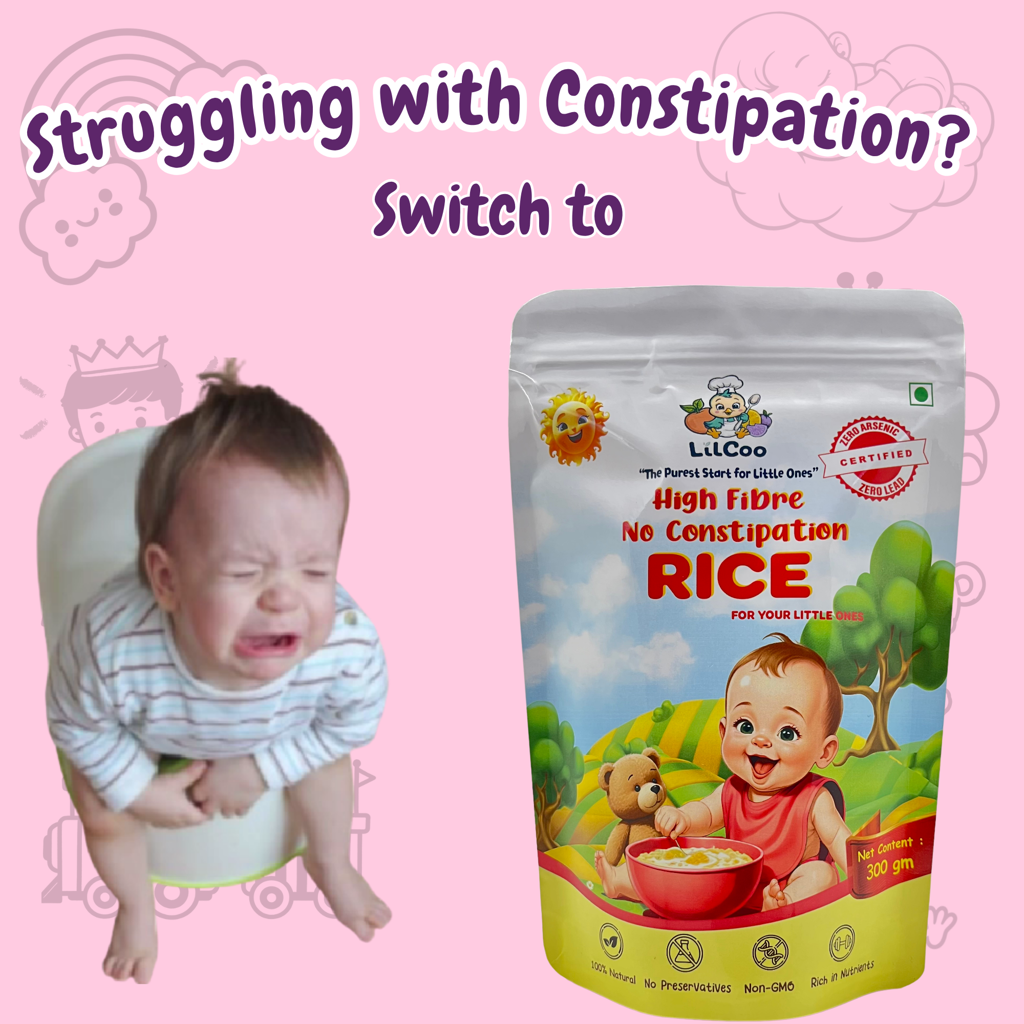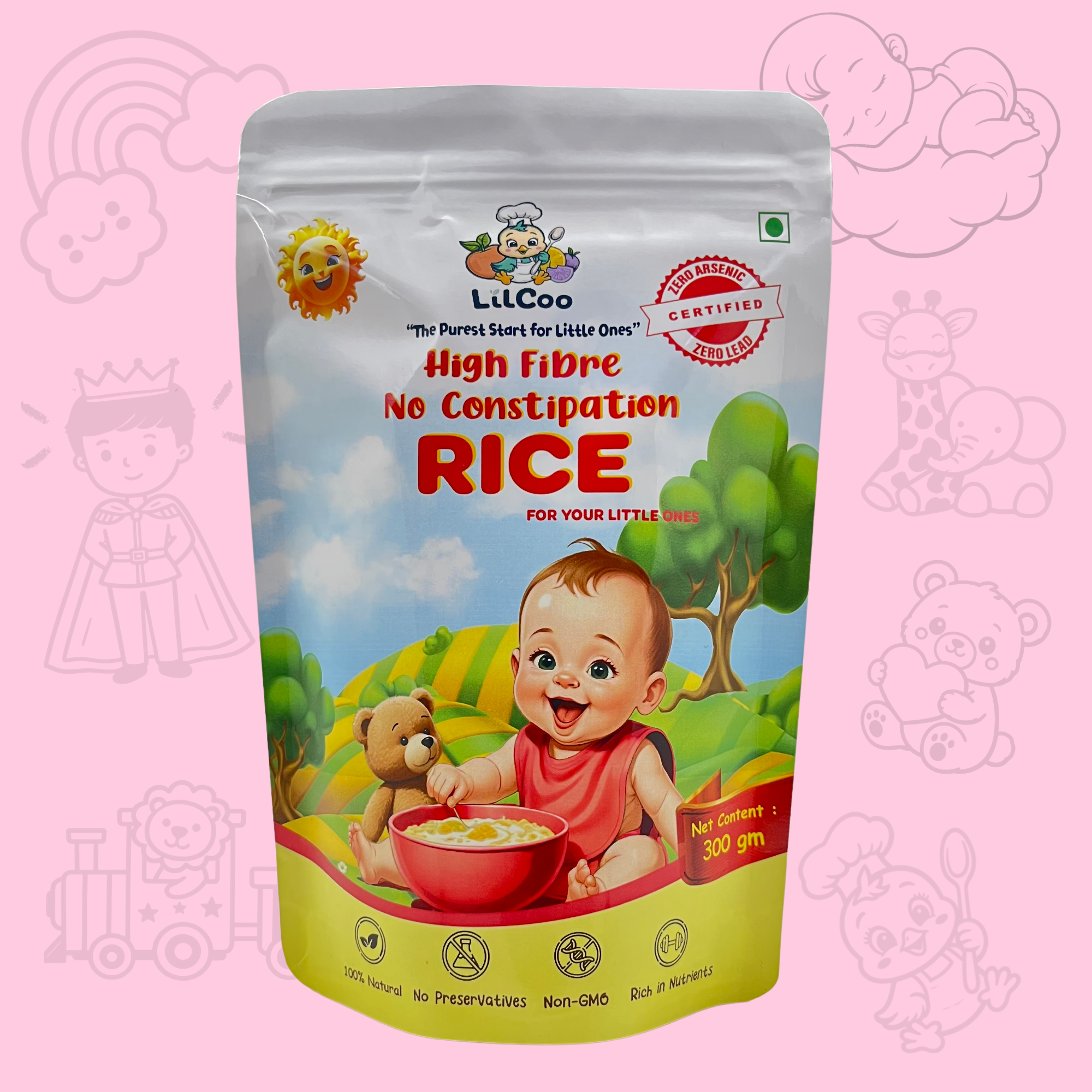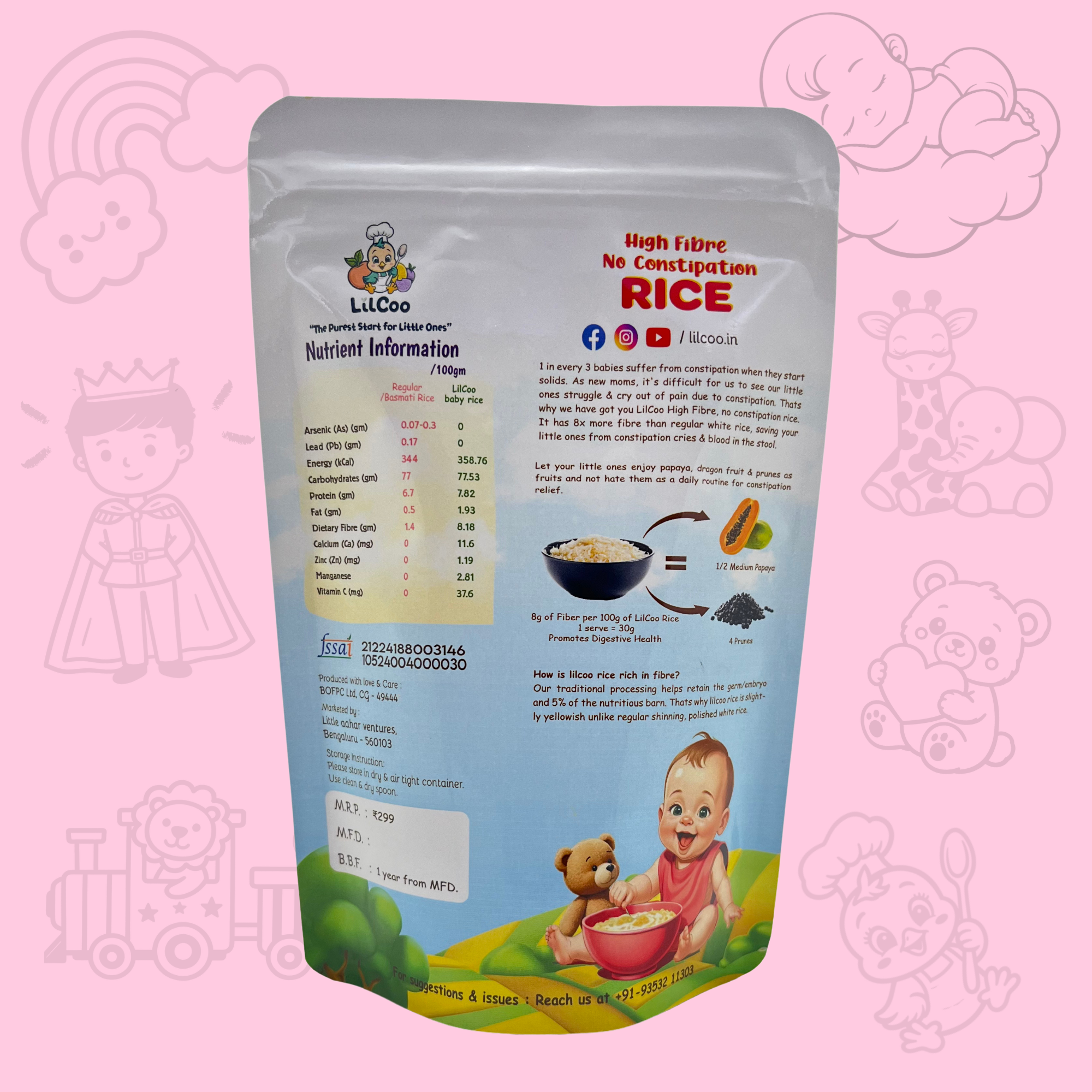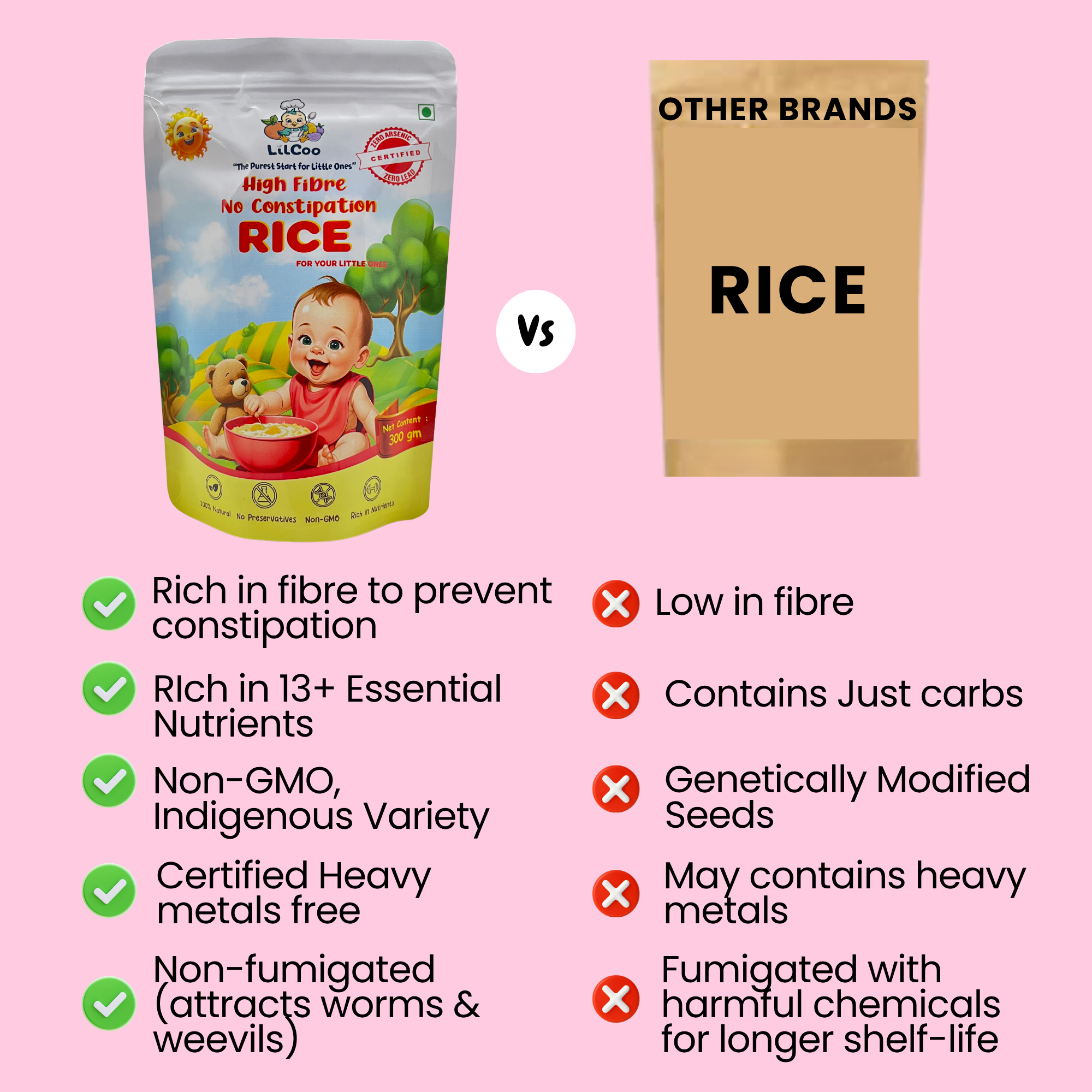 1 in 3 little tummies face constipation when they start solids. Constipation causes hard stools, pain and blood in stool for the little ones. Why let your little ones struggle when you can avoid constipation completely? Introducing LilCoo High Fibre, No Constipation Rice – The only rice in India which has 6X more fibre than regular rice. Its quick to cook, yummy, light on little tummies, easy to digest, rich in nutrients, maintains good gut health and the best of all – No constipation struggles! Why run around searching for P fruits and constipation remedies? Prevention is better than cure. Let your little ones enjoy P fruits as fruits and not get sick of them as constipation relievers. But how does lilcoo rice contain so much fibre? We follow traditional & labour intensive dehusking process to carefully leave behing the germ/embryo and 5% of the barn in the rice itself. That is why lilcoo rice is slight yellowish in color when compared to shiny, white store-bought rice. LilCoo High Fibre No constipation rice is 100% natural, No GMO, grown from indigenous seeds. We do NOT use insecticides, pesticides, herbicides and chemical fertilizers. So, zero chemical and zero toxins. Just the best from Mother Nature. As pure as a mom’s love.