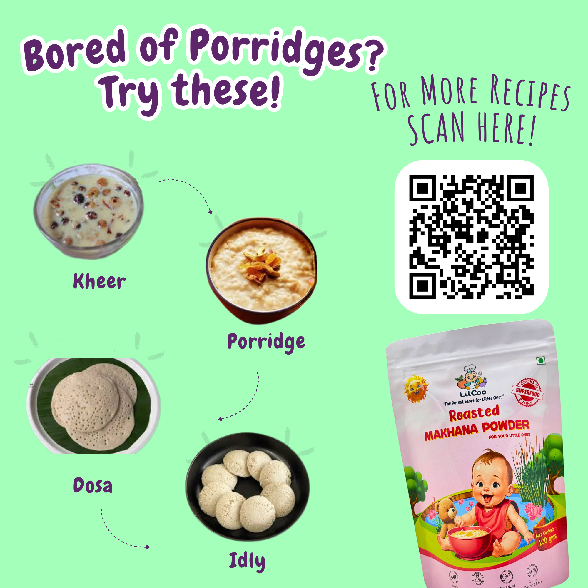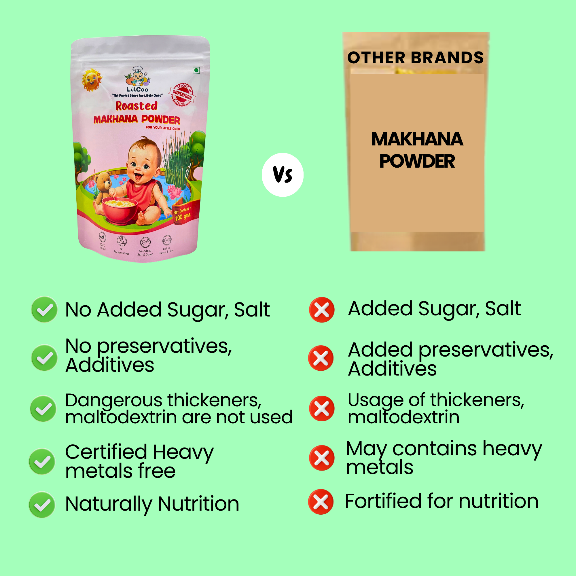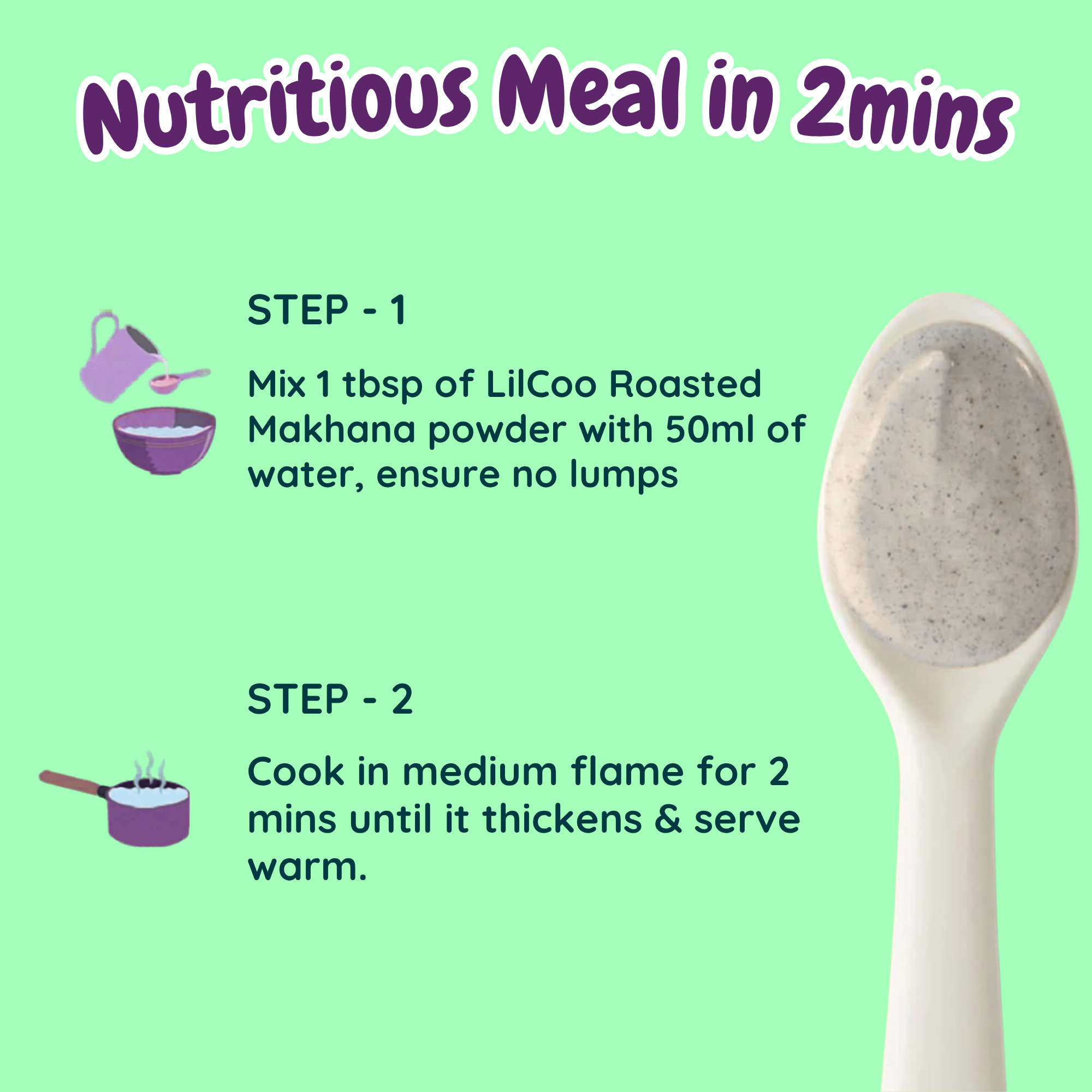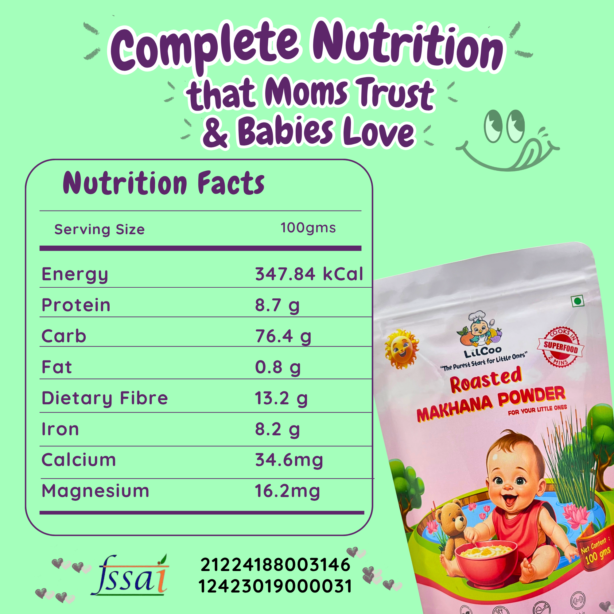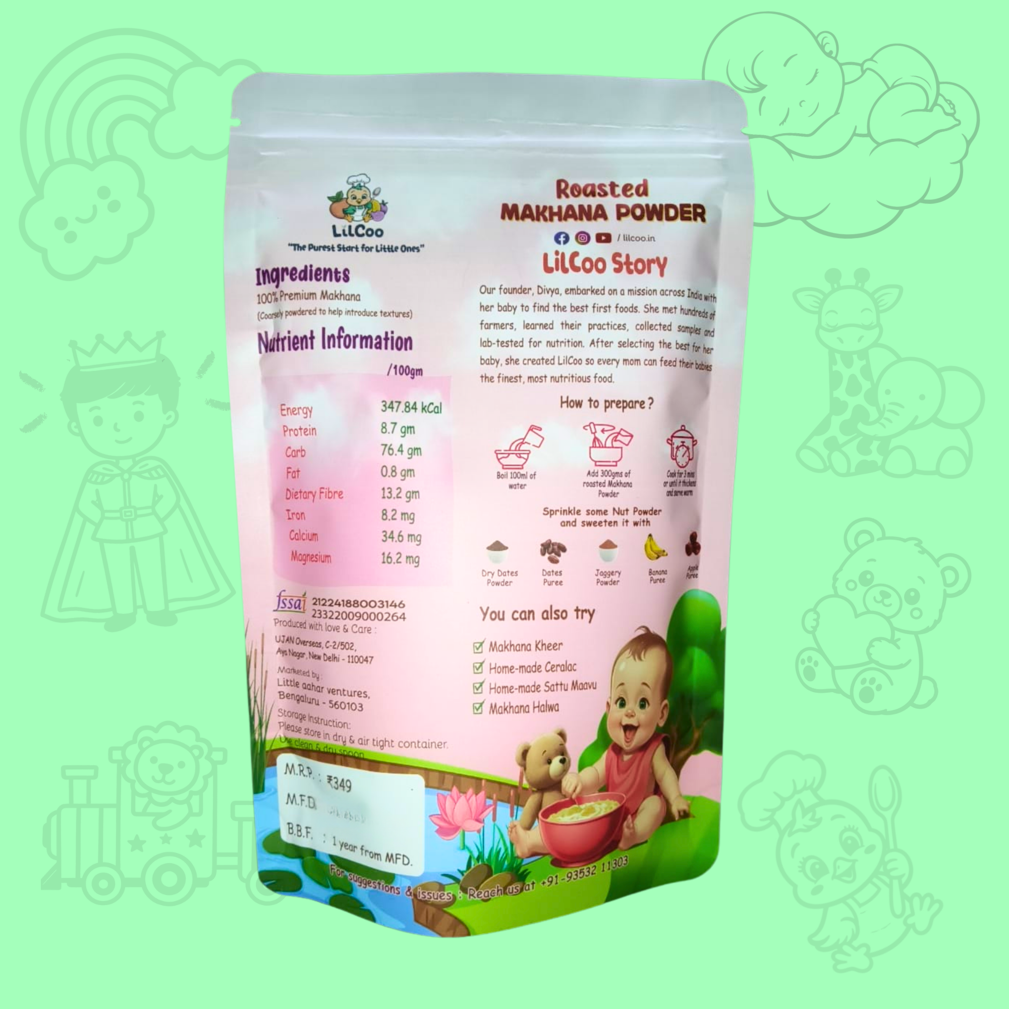 Premium hand-picked Makhana (Lotus seeds/Foxnuts) are roasted to perfection and coarsely ground to help you introduce textures to your little ones. Unlike the porridge mixes available in the market, LilCoo Roasted Makhana powder does not contain anything other than 100% premium foxnuts. Foxnuts are rich in protein, anti-oxidants, fibre and whole lots of vitamins and minerals which aid a holistic growth and development for your little ones. LilCoo Roasted Makhana can be introduced as one of the first foods for your little one as it is 100% safe and hypo-allergic. Use it to make kheer, porridges like a oatmeal and halwa. You can also add this superfood while you prepare your home-made sattu maavu.