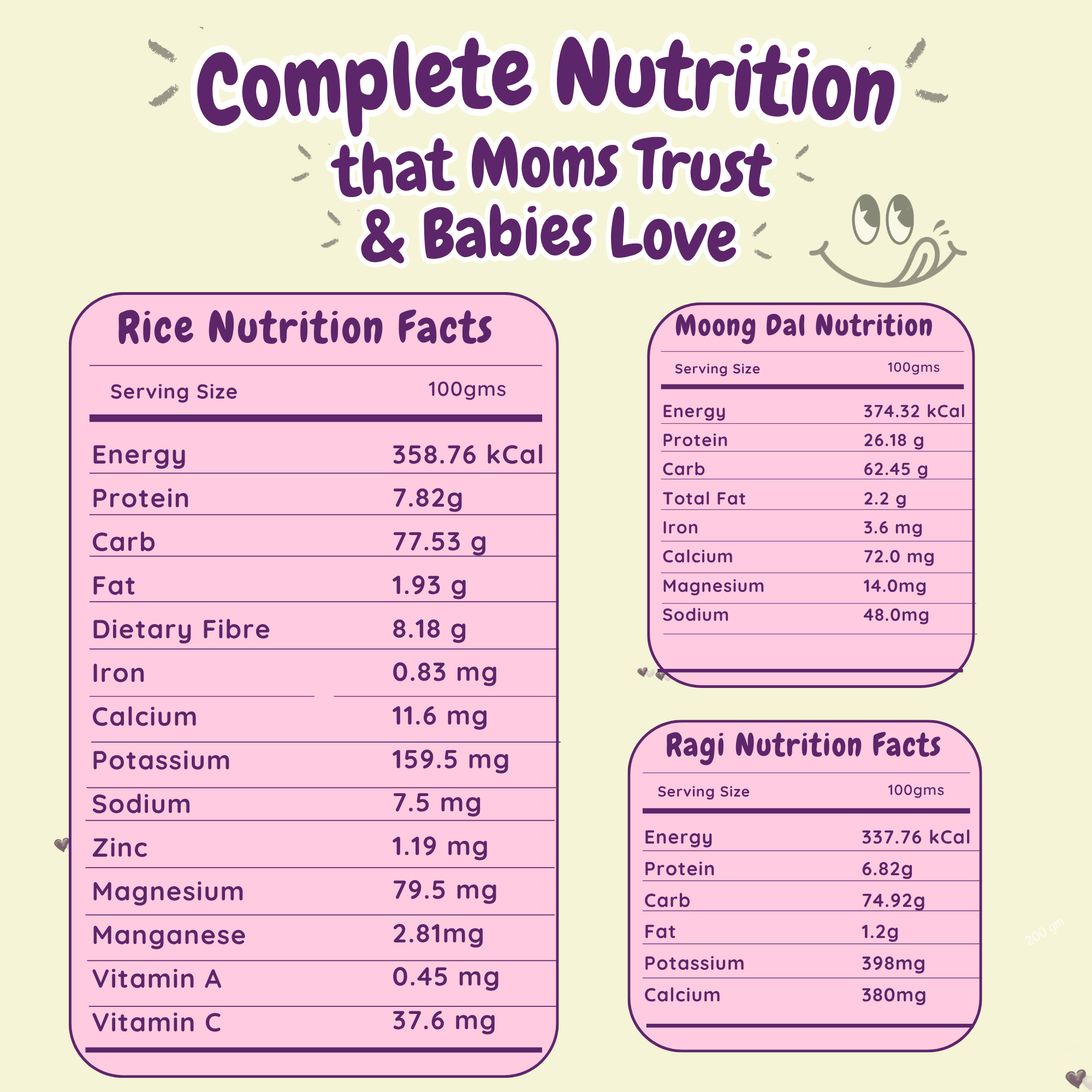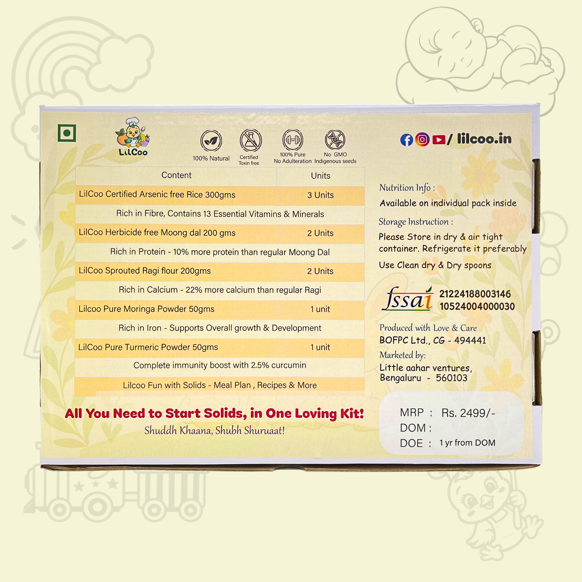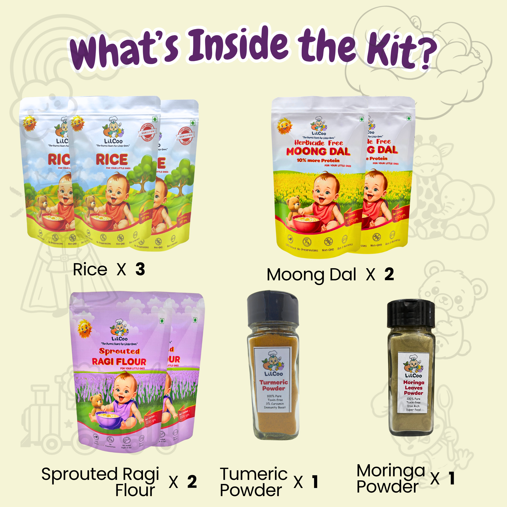 Starting Solids can be overwhelming to a new mom. Thats why we have got you LilCoo Solid start essential kit – everything that you need to start solids in a single kit. Certified Toxin free Rice, Moong dal, Sprouted Ragi Flour, Turmeric Powder and Moringa Powder. The kit has been designed to ensure your little one gets all essential nutrients for healthy growth, weight gain, brain development and immunity boost. All LilCoo products are grown in nutrient rich soil, rain fed fields, 100% manually processed – no machines, 100% organic & natural and grown from indigenous & non GMO seeds. You can feel this as soon as you open the pack. This is the best gift for Annaprasannam or Annaprashan or Chorunnu. The kit contains Rice which is rich in 13 essential nutrients – especially fibre to avoid constipation & healthy weight gain, moong dal which has 10% more protein for strong growth, sprouted ragi/nachni/finger millet powder which has 10% more calcium for stronger bones & teeth, 100% pure & unadulterated turmeric powder which has 5% curcumin for immunity boost and 100% pure & unadulterated moringa powder which is rich in iron to avoid anemia. This is a MUST have for every new mom. We focus on buying high chairs, silicone plates and spoons, suction cups which solves for “how we feed”. Mommies should focus more on “what we feed too”. Little tummies should be filled with better nutrition and our regular rice and dal have very poor nutrition content and might have toxins too. So switch now to naturally nutri-dense staples while buying your sturdy high chair with cushions and silicon suction plates and spoons. Every mom buying high chair and planning to start solids should buy this kit to ensure the baby gets complete nutrition.