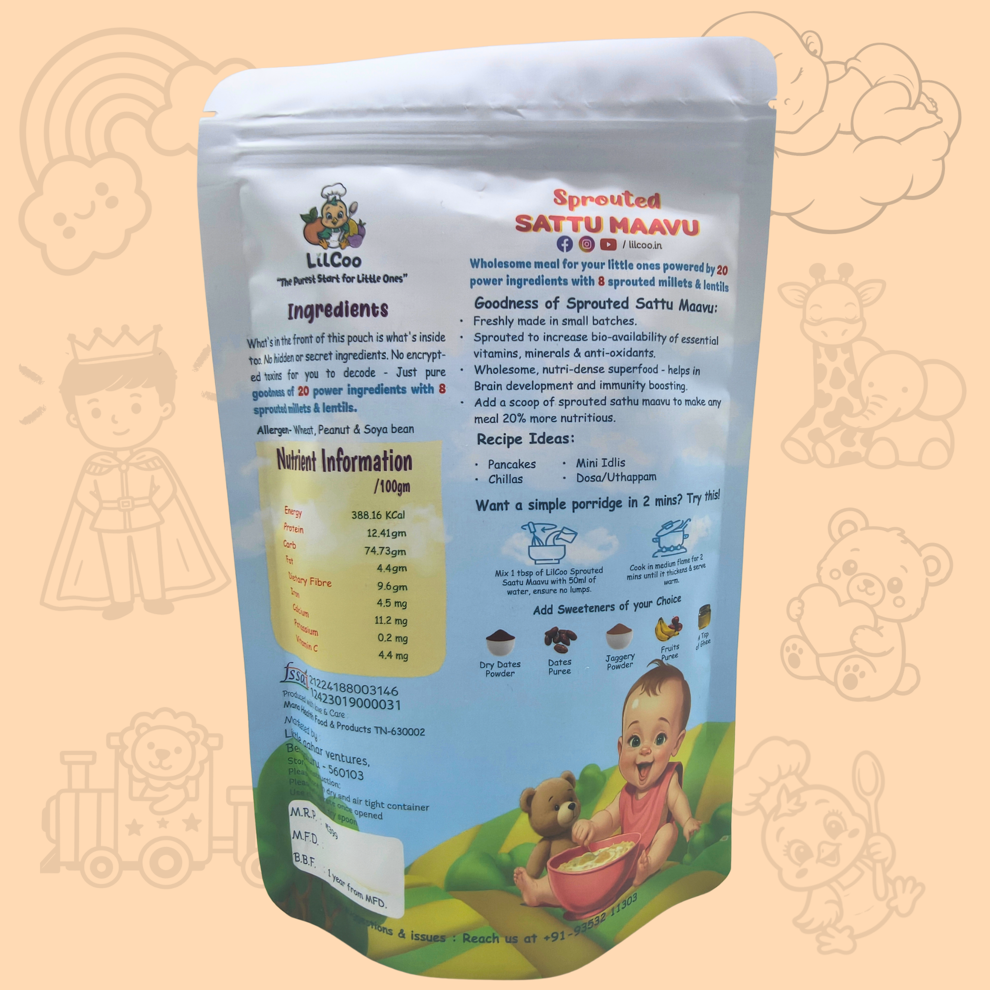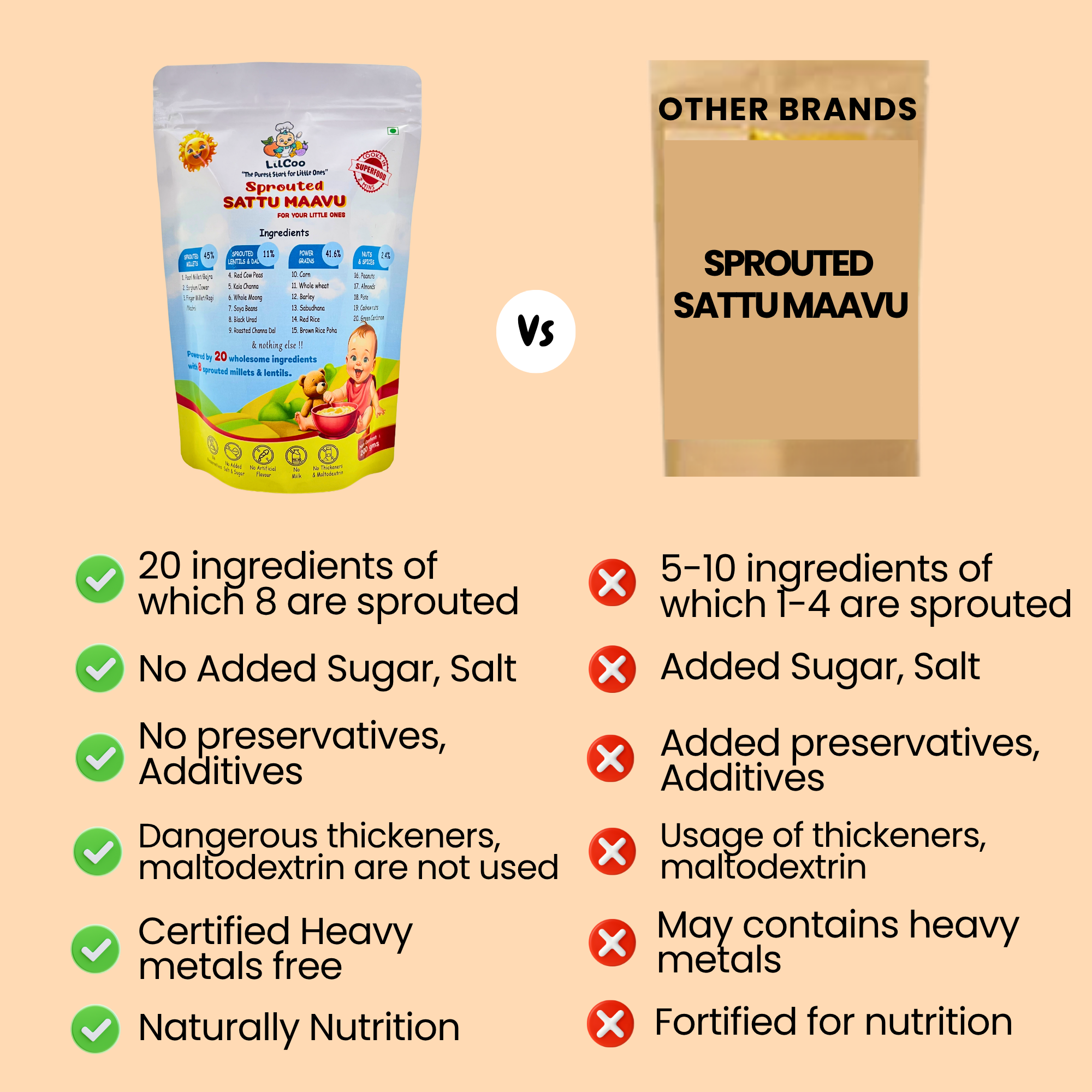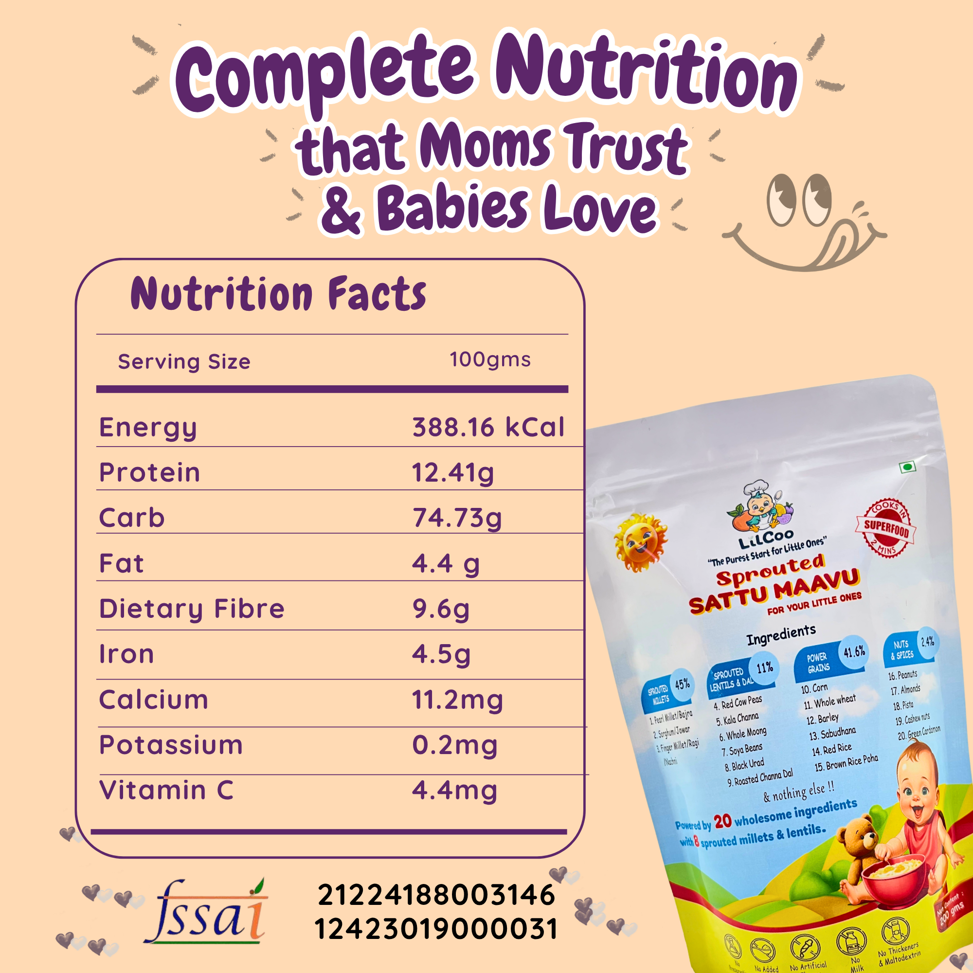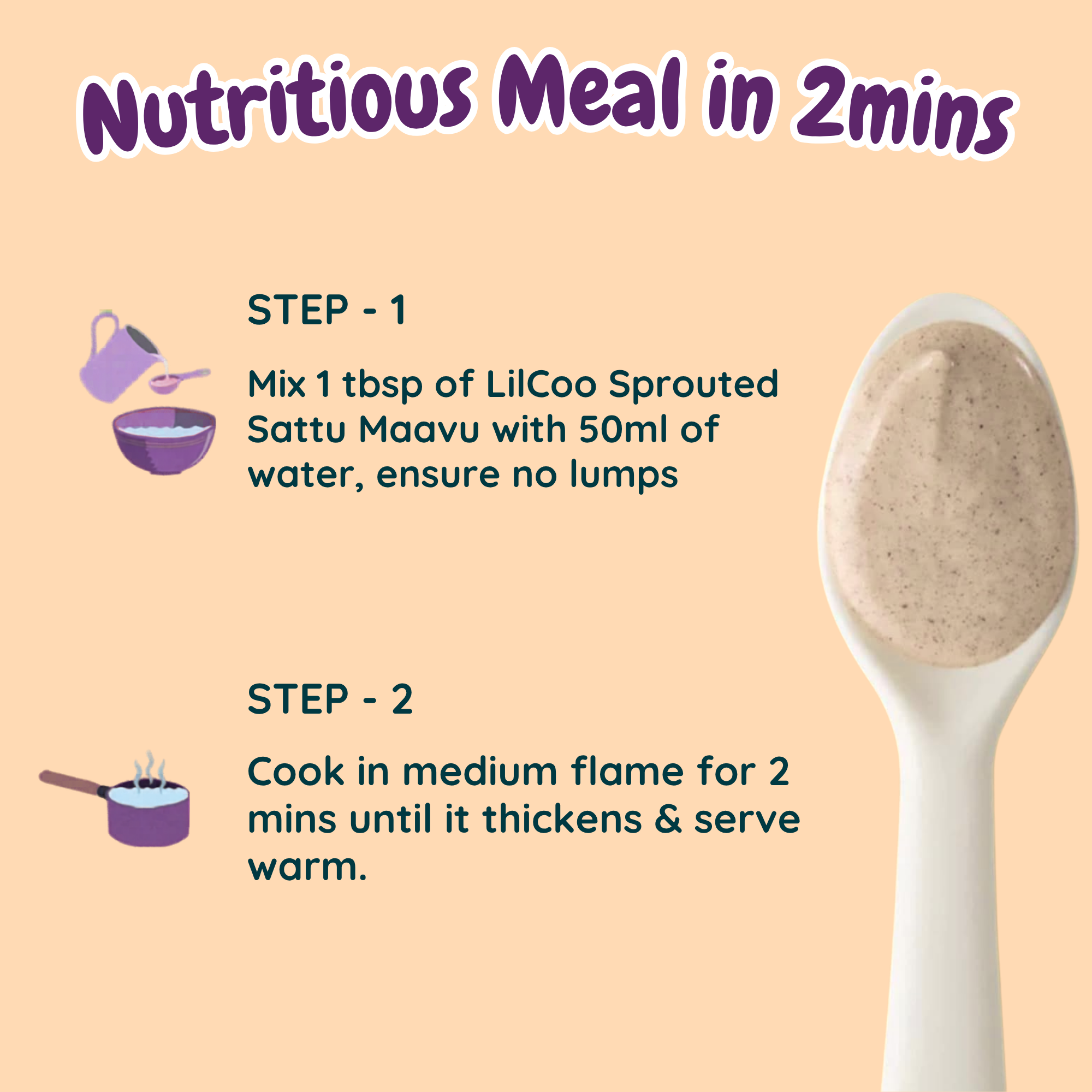 Powered by 20 natural ingredients of which 8 are sprouted. Sprouting helps the rate at which micronutrients get absorbed. Hand-picked, 100% natural ingredients grown without any pesticides, insecticides, herbicides, chemical fertilizers. Contains sprouted millets – ragi/nachni, jowar, bajra + power grains + sprouted pulses and lentils + nuts and seeds + spices. Perfect nutritious start to your little ones day. Ideal for porridge. Cooks in 2 minutes. If you wish to amp up the nutrition in idli, dosa, cheela, muffins, cup cakes, pancakes, etc – just add a scoop of LilCoo sprouted sattu maavu and rejoice. Contains no added sugar (we mean it when we say it – we do NOT add brown sugar, jaggery powder, unrefined white sugar, palm sugar, artificial sweetners, maltodexterin or mildly sweetening with dates powder) No salt. No preservatives, No articial flavours. No Toxins.