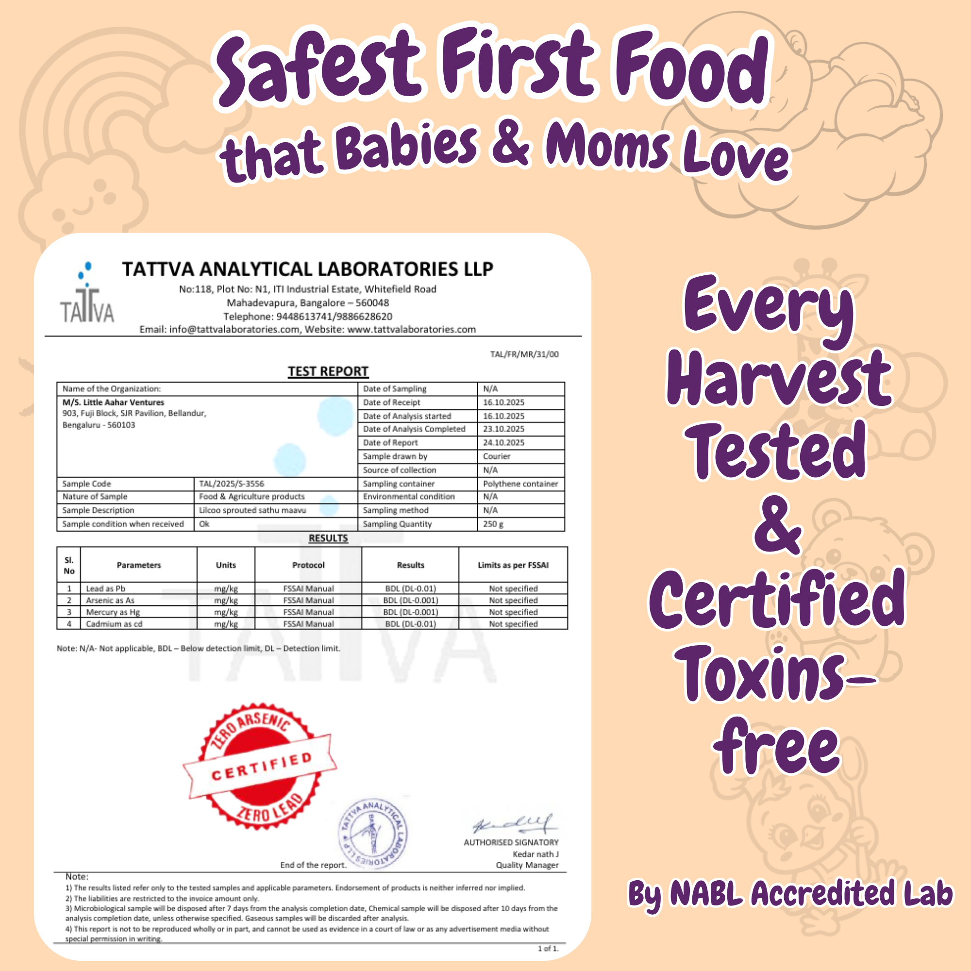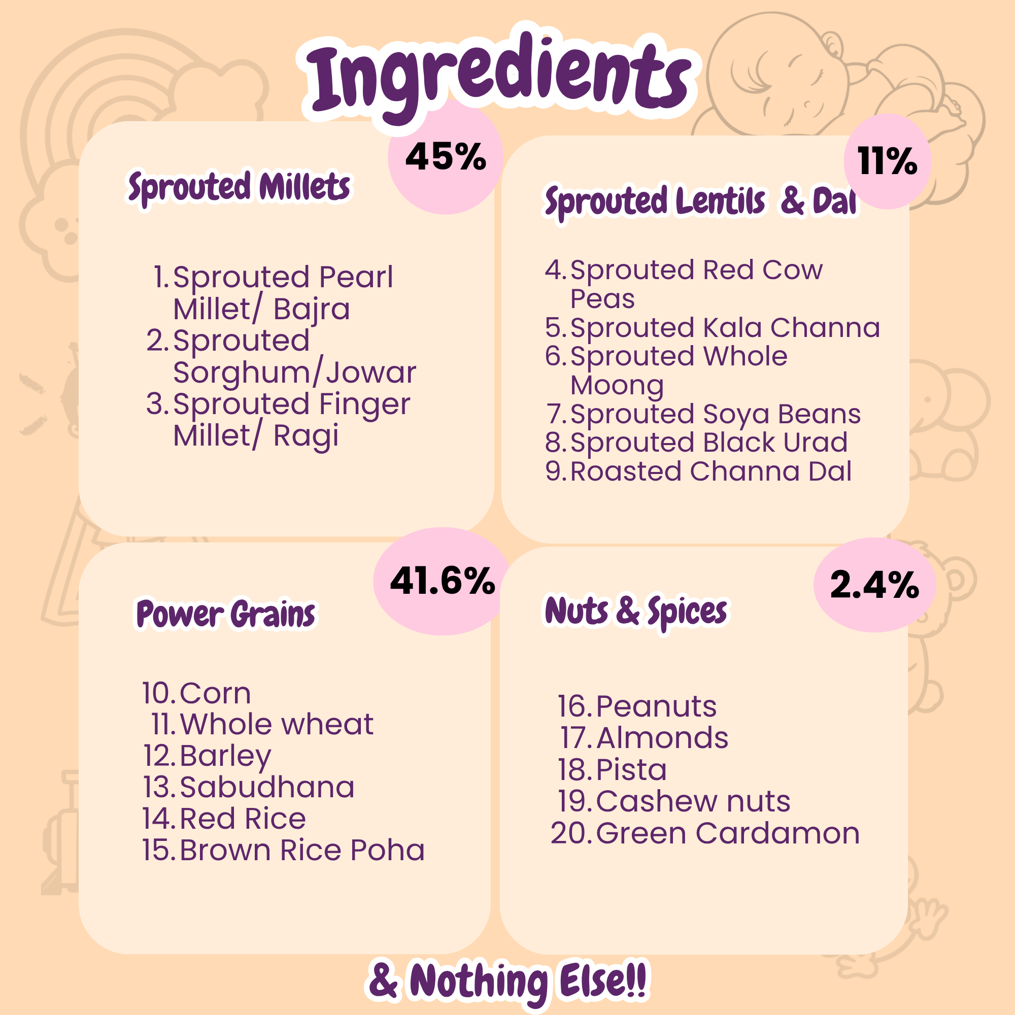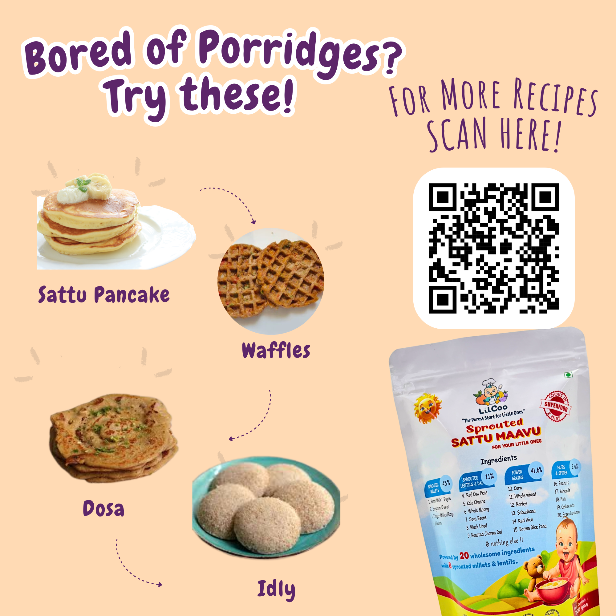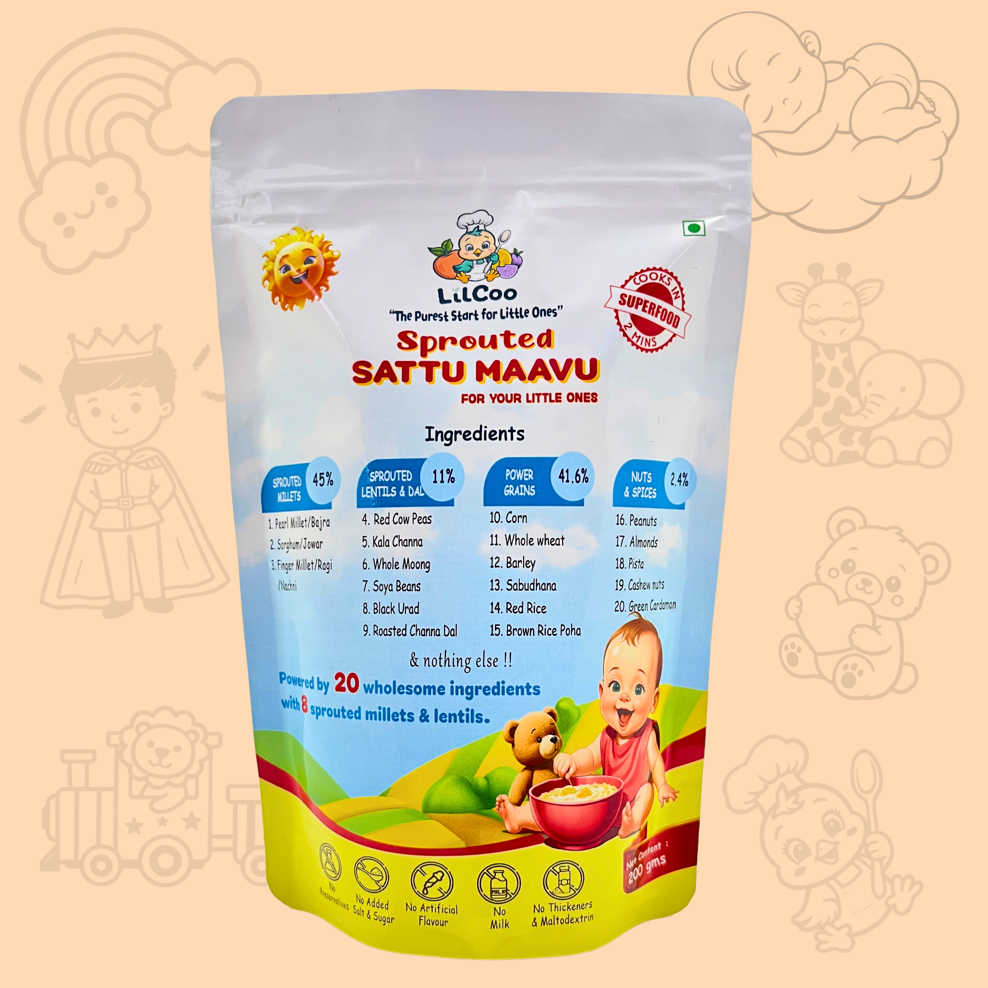 Powered by 20 natural ingredients of which 8 are sprouted. Sprouting helps the rate at which micronutrients get absorbed. Hand-picked, 100% natural ingredients grown without any pesticides, insecticides, herbicides, chemical fertilizers. Contains sprouted millets – ragi/nachni, jowar, bajra + power grains + sprouted pulses and lentils + nuts and seeds + spices. Perfect nutritious start to your little ones day. Ideal for porridge. Cooks in 2 minutes. If you wish to amp up the nutrition in idli, dosa, cheela, muffins, cup cakes, pancakes, etc – just add a scoop of LilCoo sprouted sattu maavu and rejoice. Contains no added sugar (we mean it when we say it – we do NOT add brown sugar, jaggery powder, unrefined white sugar, palm sugar, artificial sweetners, maltodexterin or mildly sweetening with dates powder) No salt. No preservatives, No articial flavours. No Toxins.
