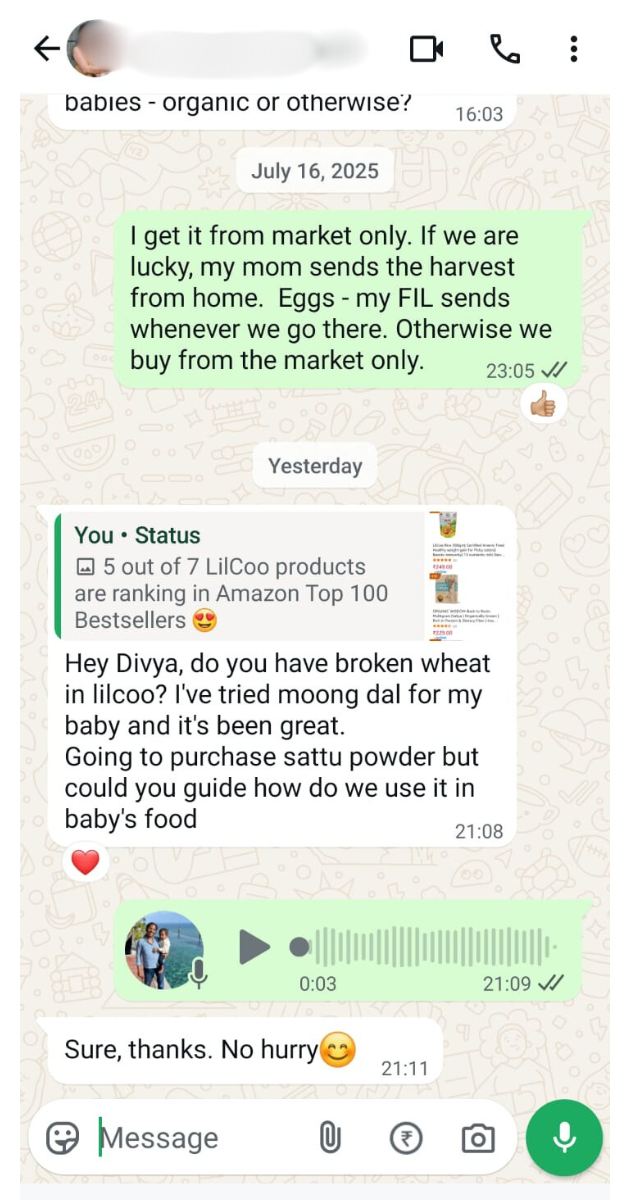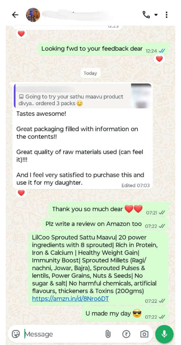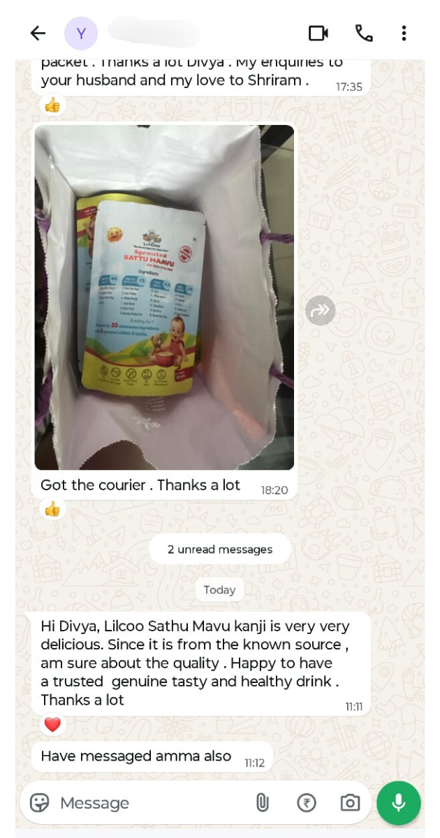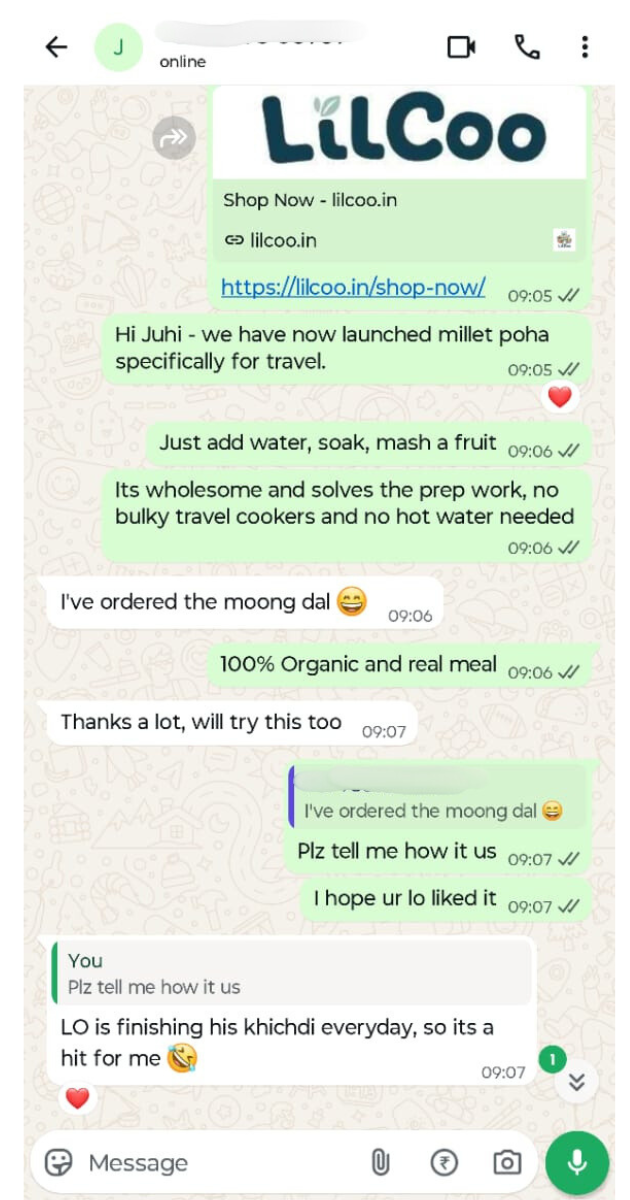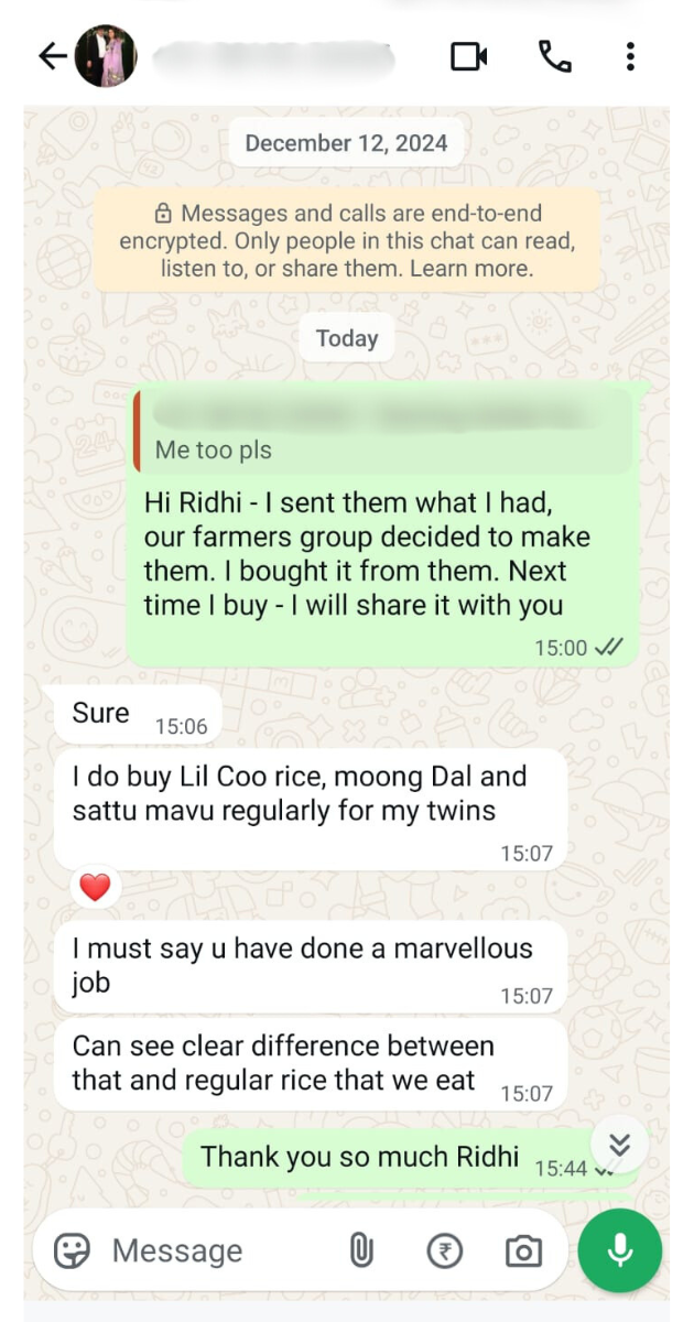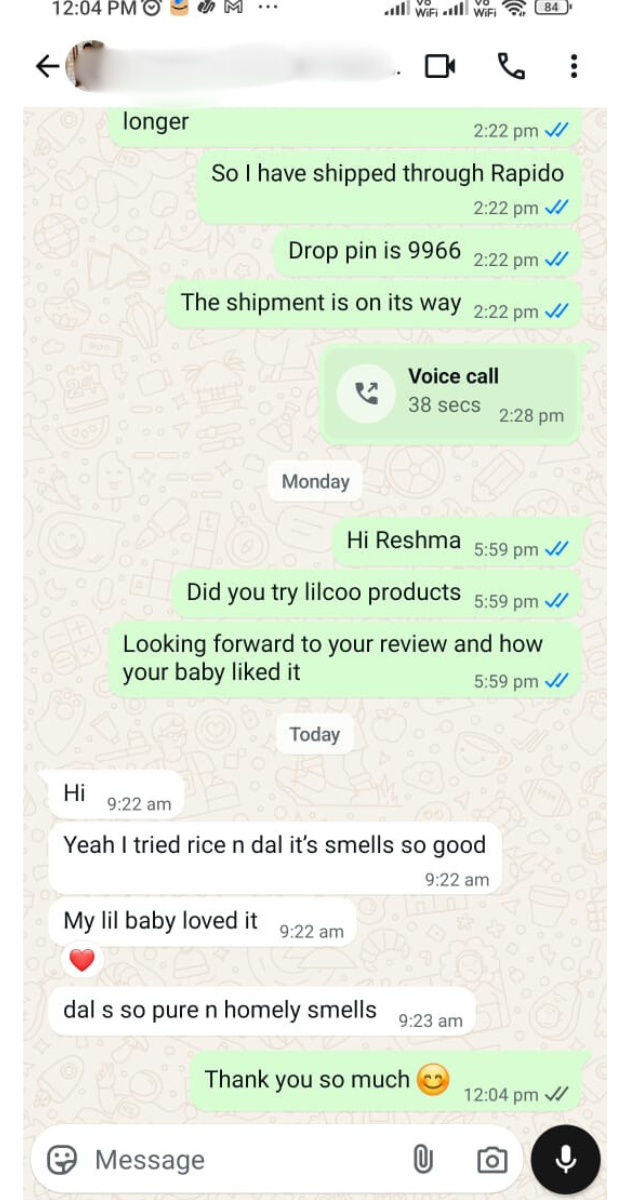 A customer, upon learning she's talking to the LilCoo founder, expressed how her baby loves the soft khichdi made from the rice.