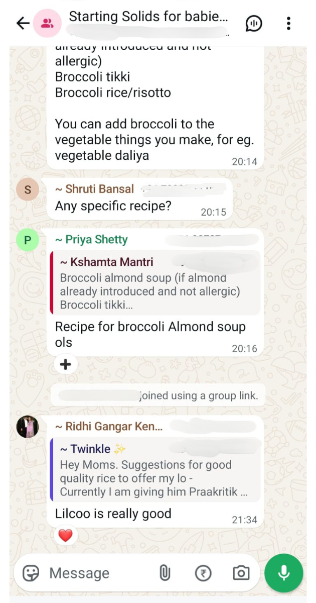 In a Bangalore mom's group, when one mom asked for rice suggestions, another recommended LilCoo's arsenic-free rice with a product link.