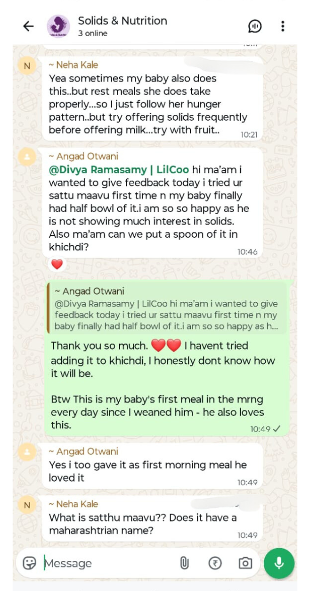 When moms discussed food ideas, one replied that LilCoo rice with moong dal, carrot, and ghee is a huge hit with her baby.