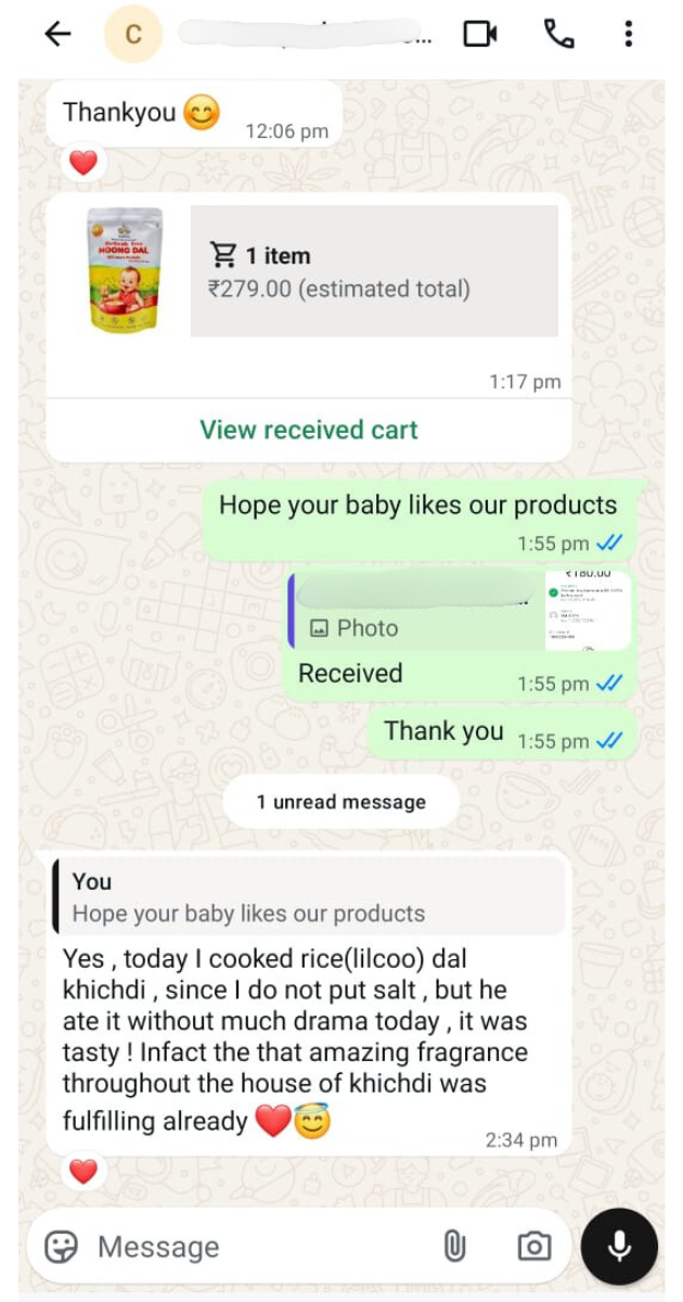 After trying a product, a mom said her baby liked it and asked the founder for more exciting recipes and a product catalogue.