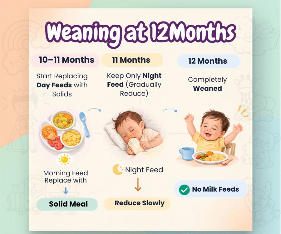 - Slowly wean the remaining night feeds as the baby crosses 12 months